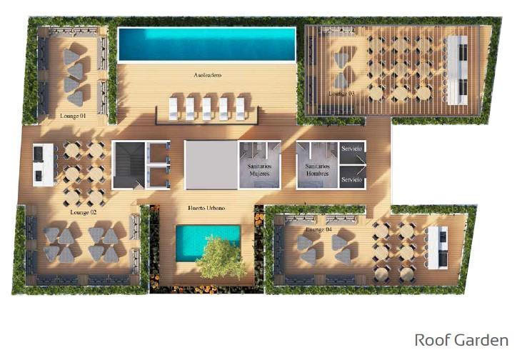 - Instalaciones : playroom, cuarto multipropósito, roof garden.